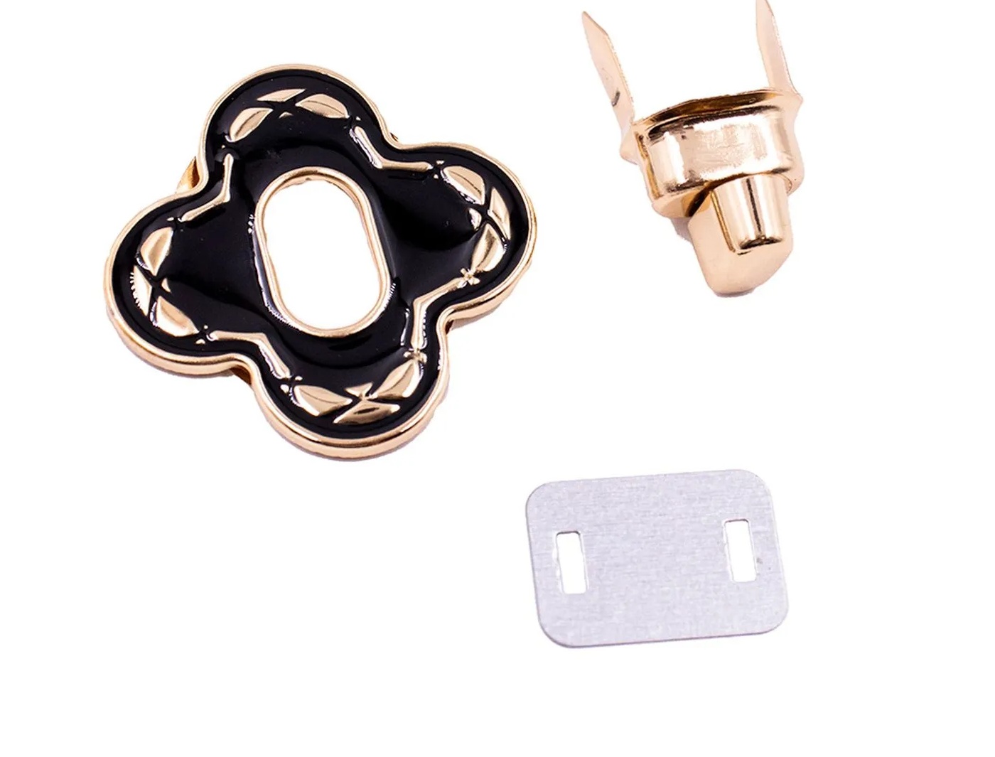 Fecho resistente e elegante, confeccionado em metal de alta durabilidade. Ideal para bolsas e acessórios, garante segurança e praticidade ao mesmo tempo que acrescenta um toque sofisticado ao design. Perfeito para projetos artesanais ou comerciais que buscam acabamento de qualidade e estilo refinado. FICHA TÉCNICA: Material: 100% Metal Tipo: Fecho Formato: Trevo com Resina Tamanho: 40MM Quantidade:01