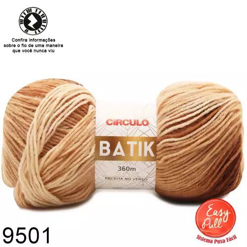 Fio 100% acrílico com efeito de cores obtido através do Batik, técnica de tingimento em tecido artesanal. Esta técnica é originária da ilha de Java na Indonésia e foi adaptada especialmente para esse fio. O efeito final na peça é belíssimo e os efeitos criados harmonizam com diversos estilos.