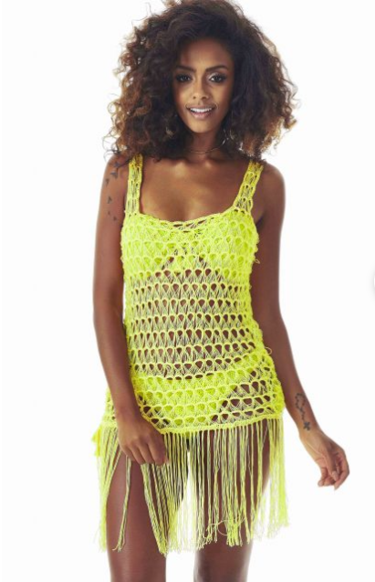 Acabamento – Costure os lados. Costure as alças a 5 cm de cada lado das costuras dos lados. Faça a toda a volta da parte inferior da peça franjas em crochê com 2 fios de 50 cm de comprimento.