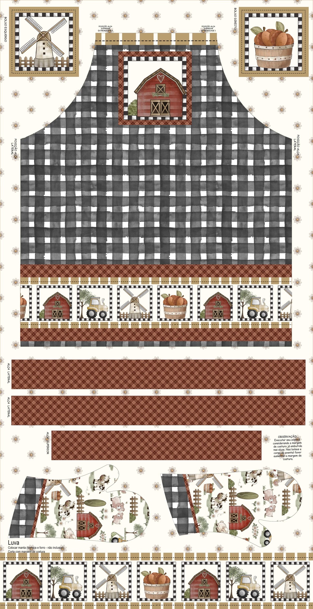 · Painel Faça você mesmo. Monte um lindo avental e uma luva de forma simples e resultado incrível. Basta recortar, aplicar a manta R2 e forro e costurar (manta e forro não inclusos). Você receberá um tecido com a estampa e o pontilhado para recorte e costura da peça.
