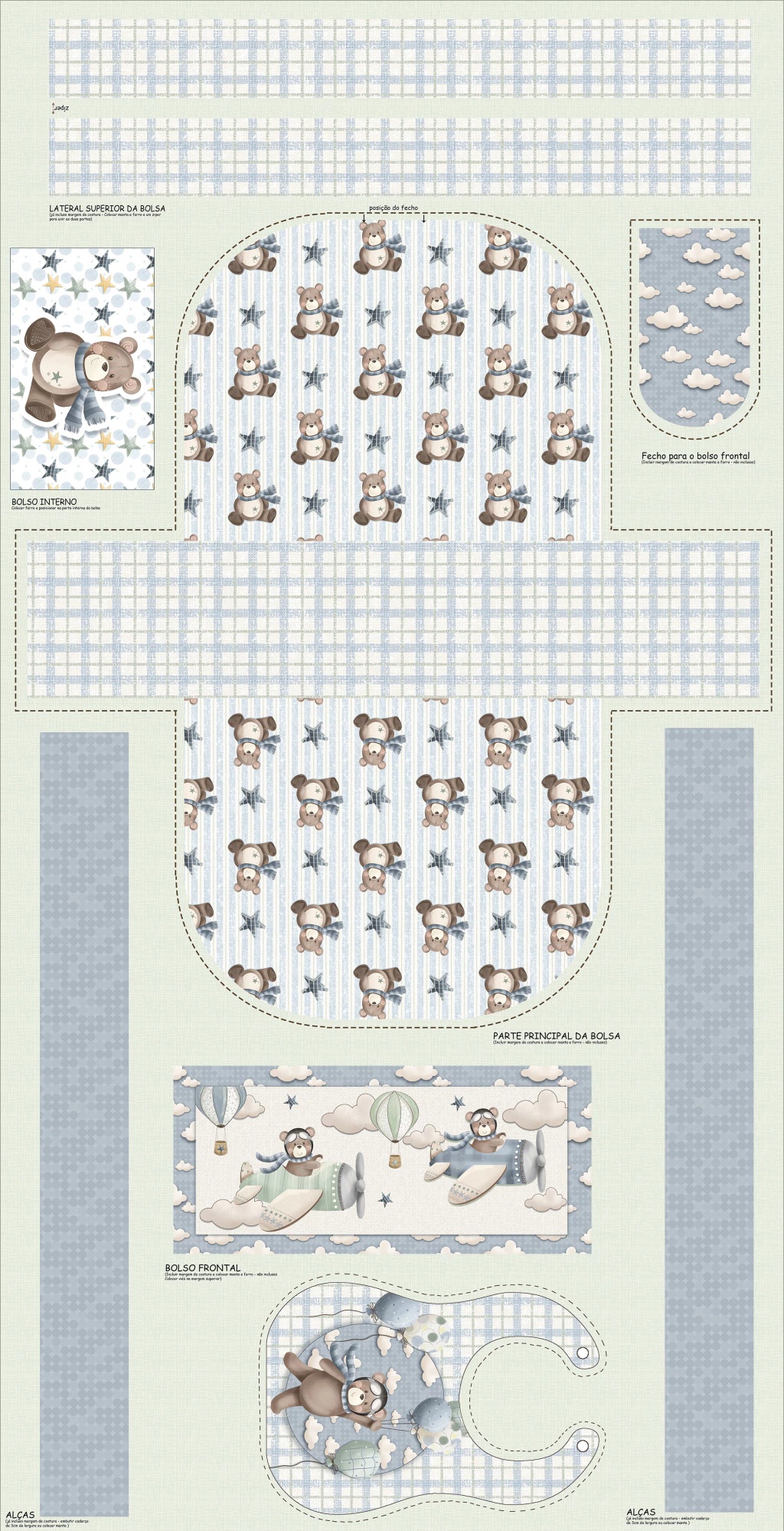 · Painel Faça você mesmo. Monte uma linda bolsa de maternidade ou bebê e um babador de forma simples e resultado incrível. Basta recortar, aplicar a manta R2 e forro e costurar (manta e forro não inclusos). Você receberá um tecido com a estampa e o pontilhado para recorte e costura da peça.
